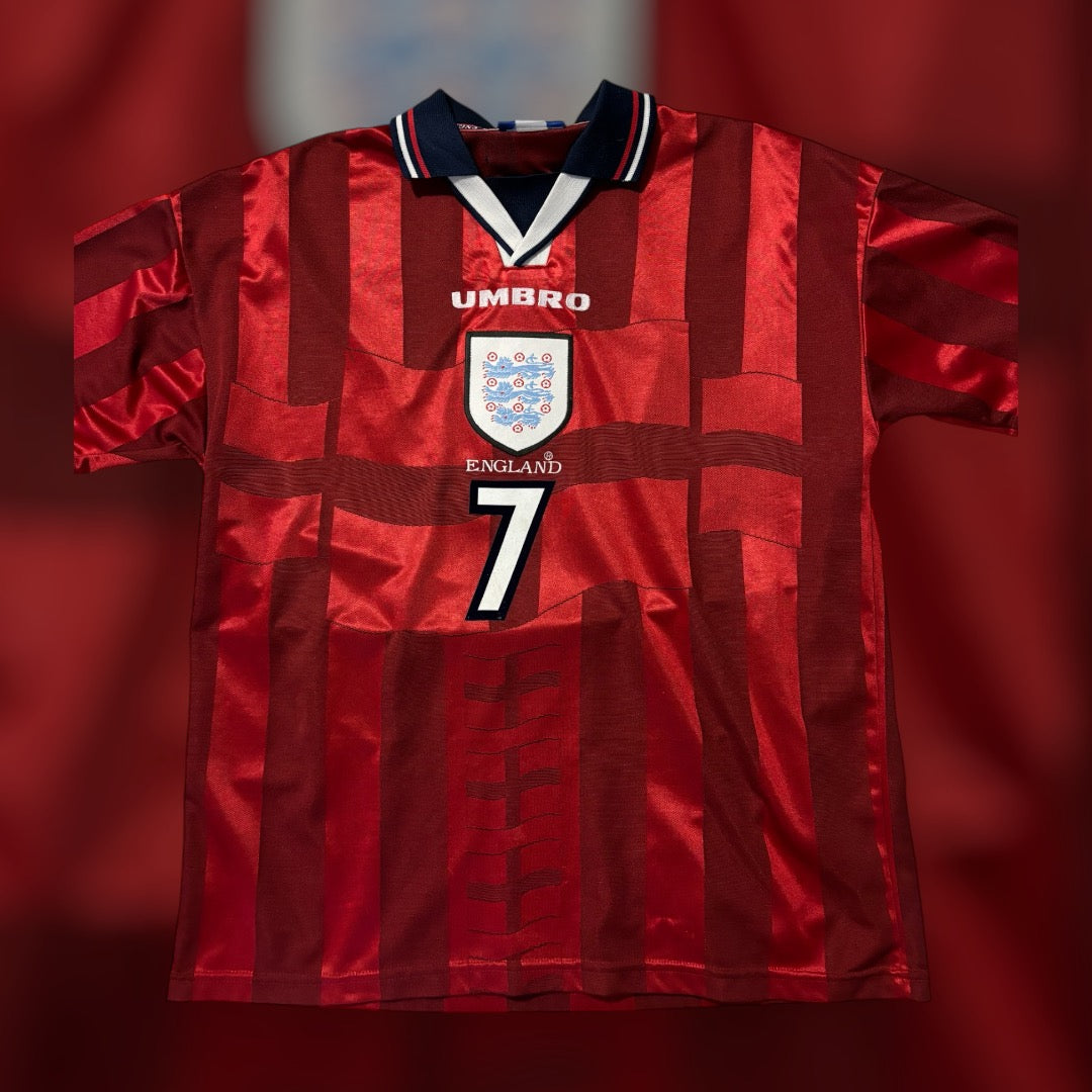 English and Global Icon David Beckham kit designed by Umbro. This kit was worn during the 1998 World Cup, where Beckham scored once and assisted once in three appearances. Beckham was notoriously given a red card for a stomp on Argentina's Diego Simeone in the round of 16 this World Cup. England would go on to lose this match on penalties, with Beckham leaving the pitch only 47 minutes into the match. Beckham would continue to be a polarizing figure during his career and would captain England later on.