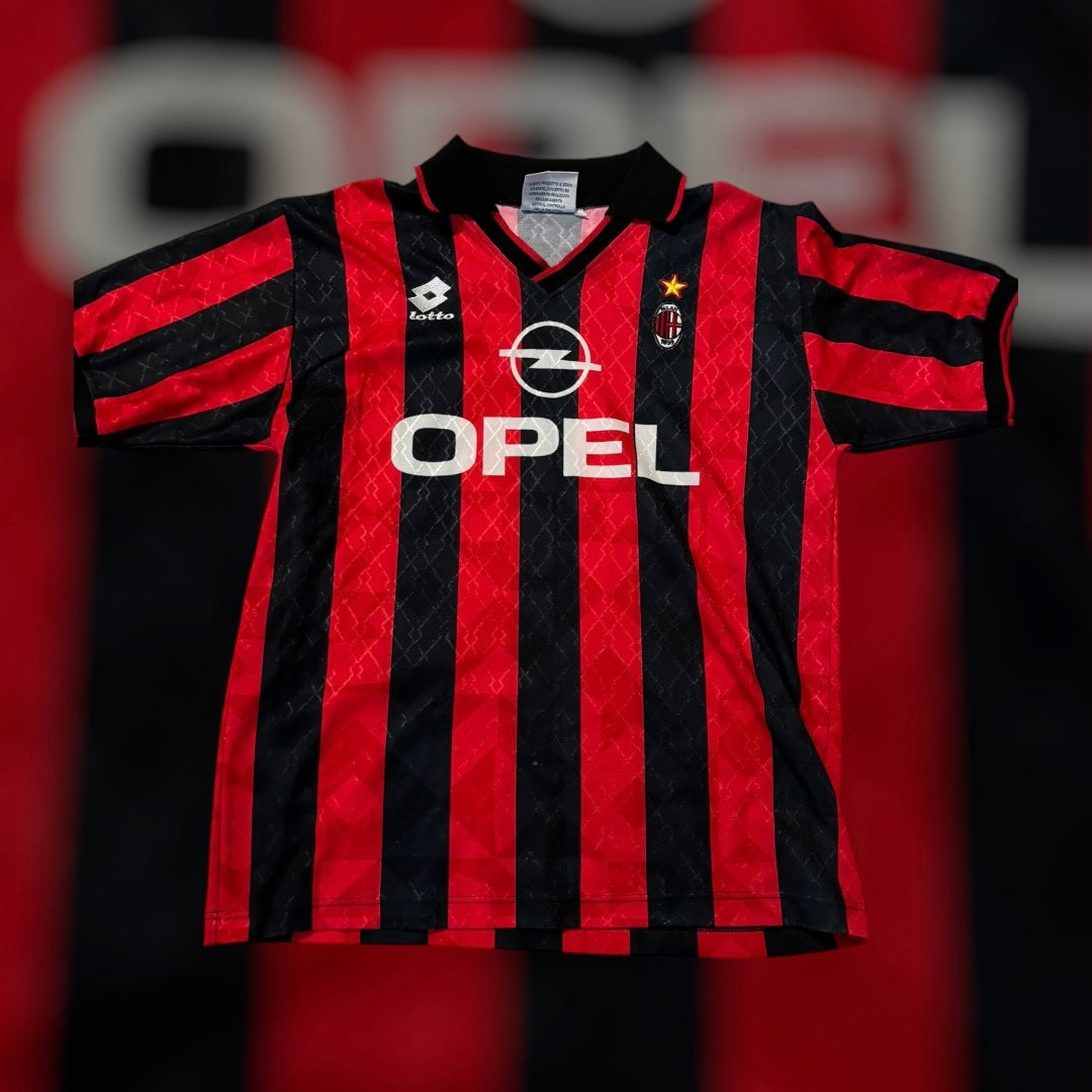This jersey was worn the season George Weah won the ballon dor. To this day the only African male player to win the prestigious award. The red and black stripes make this AC Milan kit, produced by Lotto, an instant classic. This season, Weah scored 15 goals and assisted 15 in 35 appearances. This season ended with AC Milan winning the Scudetto.