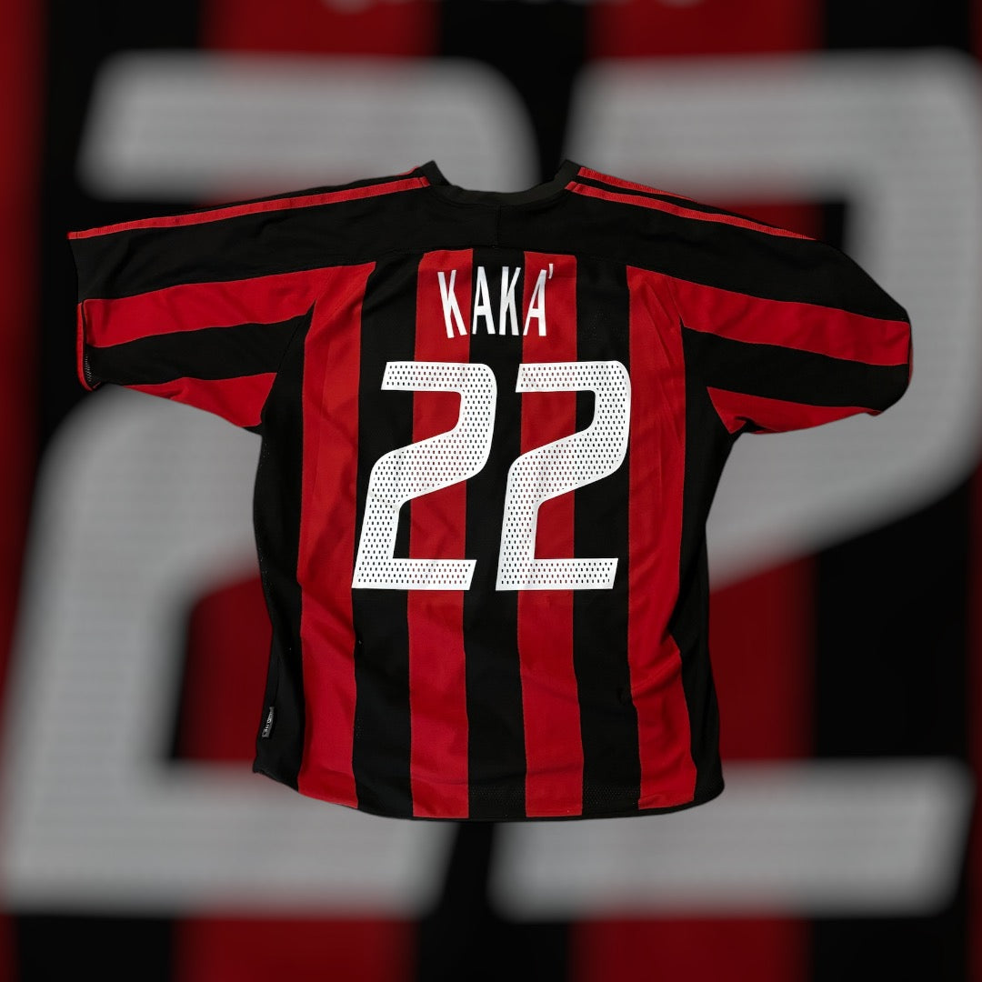 This is a classic AC Milan kit with a special font. Legend of the game Kaka played his first season with AC Milan after leaving Sao Paulo in 2003. In that season, he was a sensation, scoring 14 and assisting 6 in 44 appearances.