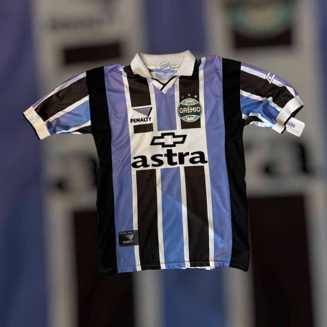 Our collection's holy grail is a rare and eye-catching Gremio 1999 away kit. It is nearly impossible to find, but this jersey is the opitimy of what we love here. It has a robust color scheme, vintage sponsors, and a cult hero on the back. This Ronaldinho kit has it all. He wore this kit in his first entire season as a professional footballer. He would excel in the Brazilian league, scoring 47 goals in 89 matches. He was only 21 by the time he left for PSG in 2001.